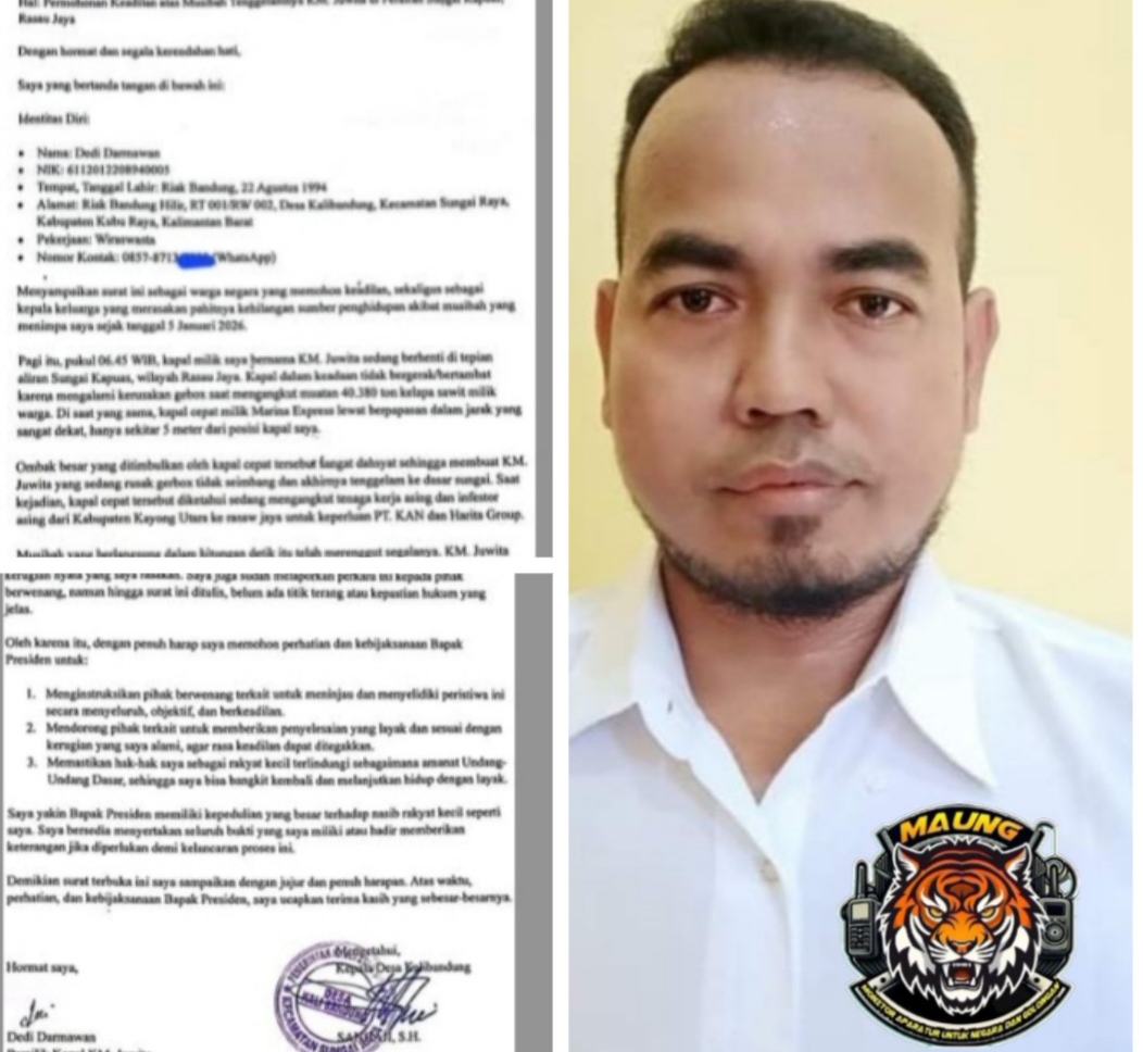 “Ini Sangat Memilukan! Jangan Ada Diskriminasi Hukum. Kami dari LSM MAUNG Kalbar sangat prihatin dan menyoroti kasus yang menimpa saudara Dedi Darmawan ini. Sungguh sangat memilukan melihat nasib rakyat kecil yang diperlakukan tidak adil. Kapal itu adalah nyawa dan satu-satunya sumber penghidupan keluarganya, namun ketika hancur karena kesalahan pihak lain, justru penyelesaiannya berjalan sangat lambat dan terkesan dipersulit” Tegasnya Rabu (15/04/26).